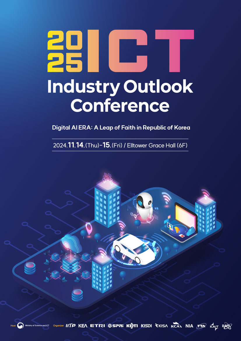 The world is undergoing an unprecedented, rapid, and widespread technological revolution, with the digital industry emerging as a crucial future sector that goes beyond national competitiveness, shaping both the economy and national security. To showcase the bright future of the Digital/AI Era, extending beyond daily lives to all sectors, the 2025 ICT Industry Outlook Conference will offer a platform to assess the current state of the ICT industry and forecast its potential and future. The theme of the 2025 ICT Industry Outlook Conference is “Digital/AI Era: Korea’s New Leap Forward.”